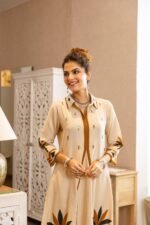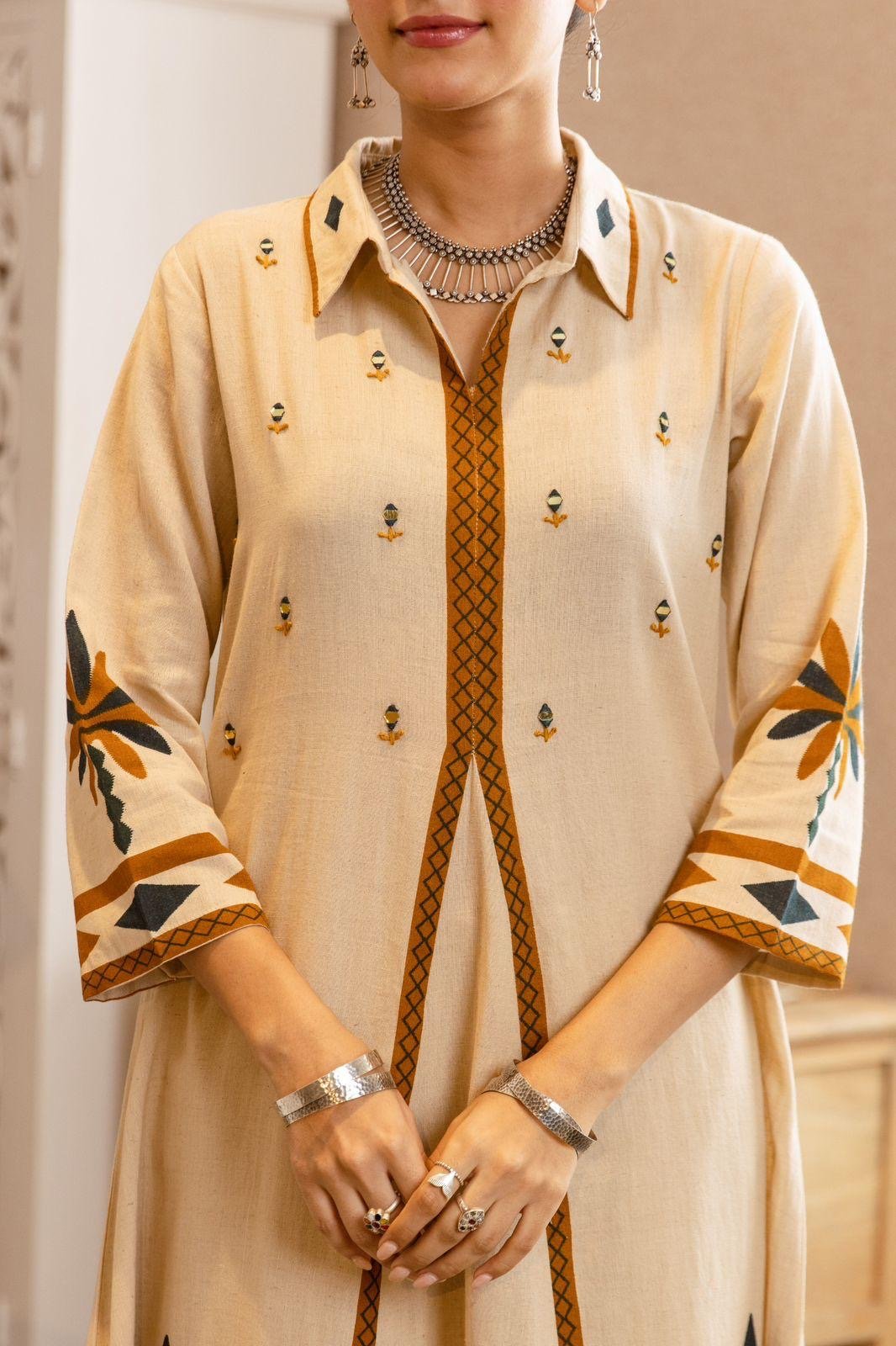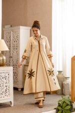 Made from premium-quality cotton flex fabric, this ensemble offers a soft feel with a structured fall, perfect for all-day wear. The soothing neutral tone is enhanced with subtle prints and delicate detailing, giving it a graceful yet modern appeal.