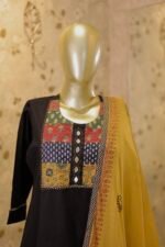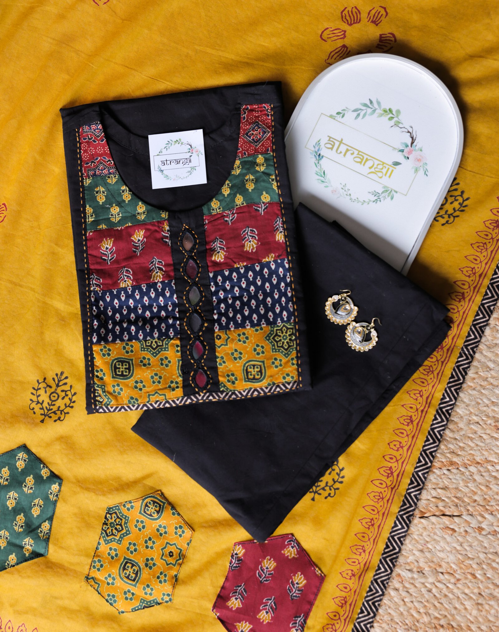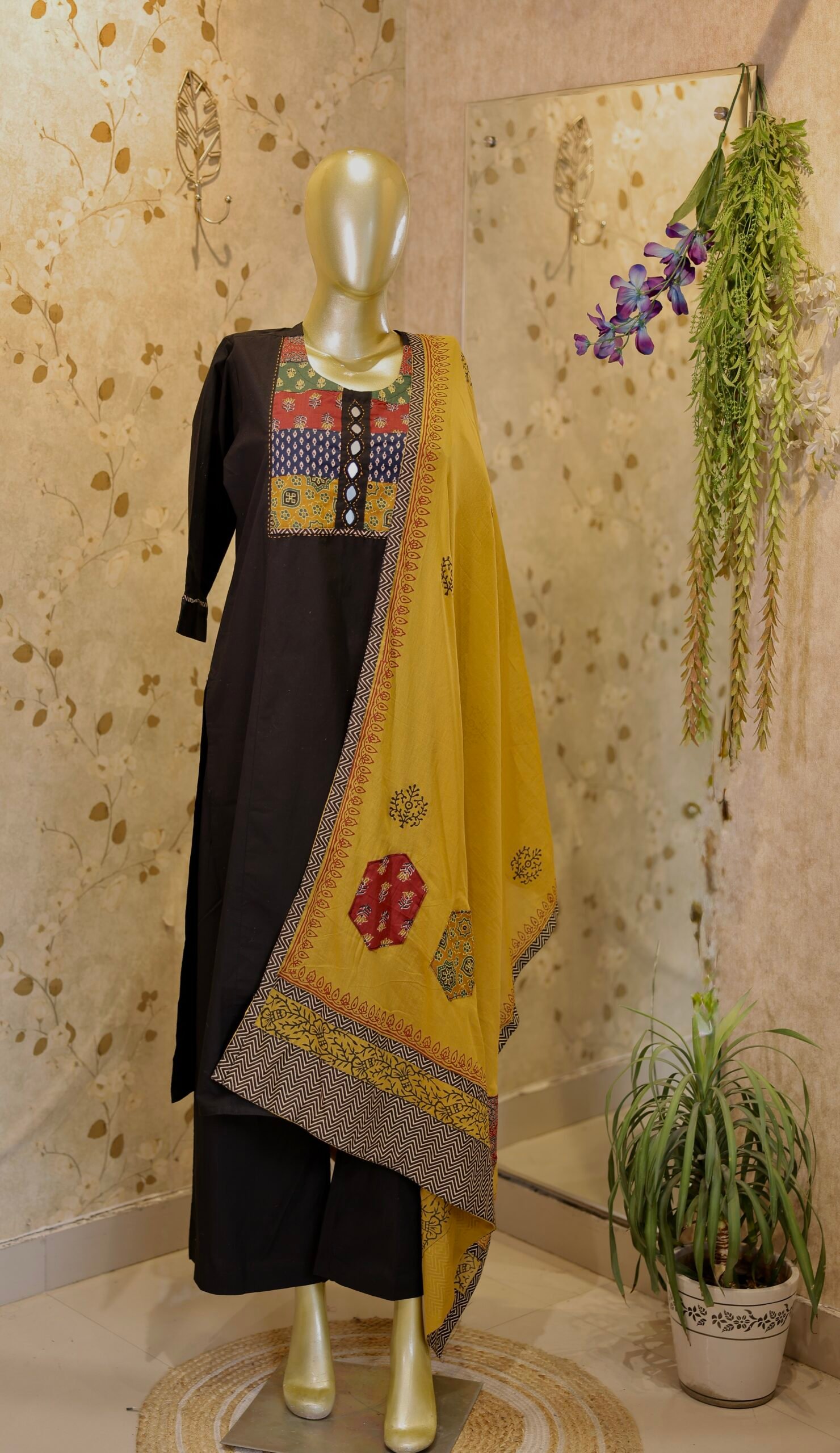 A black cotton suit with a mustard dupatta featuring patchwork is a striking and stylish combination of classic yet vibrant. Lightweight cotton for comfort and versatility. Straight-cut kurta with side slits elegant and flattering and fabric pieces giving it a handcrafted, ethnic charm. The yoke and dupatta feature traditional ajrakh print, adding a rich, artisanal touch to the ensemble. The intricate applique work elevates the design, making it perfect for festive gatherings or understated occasions where style meets heritage.