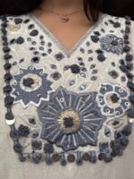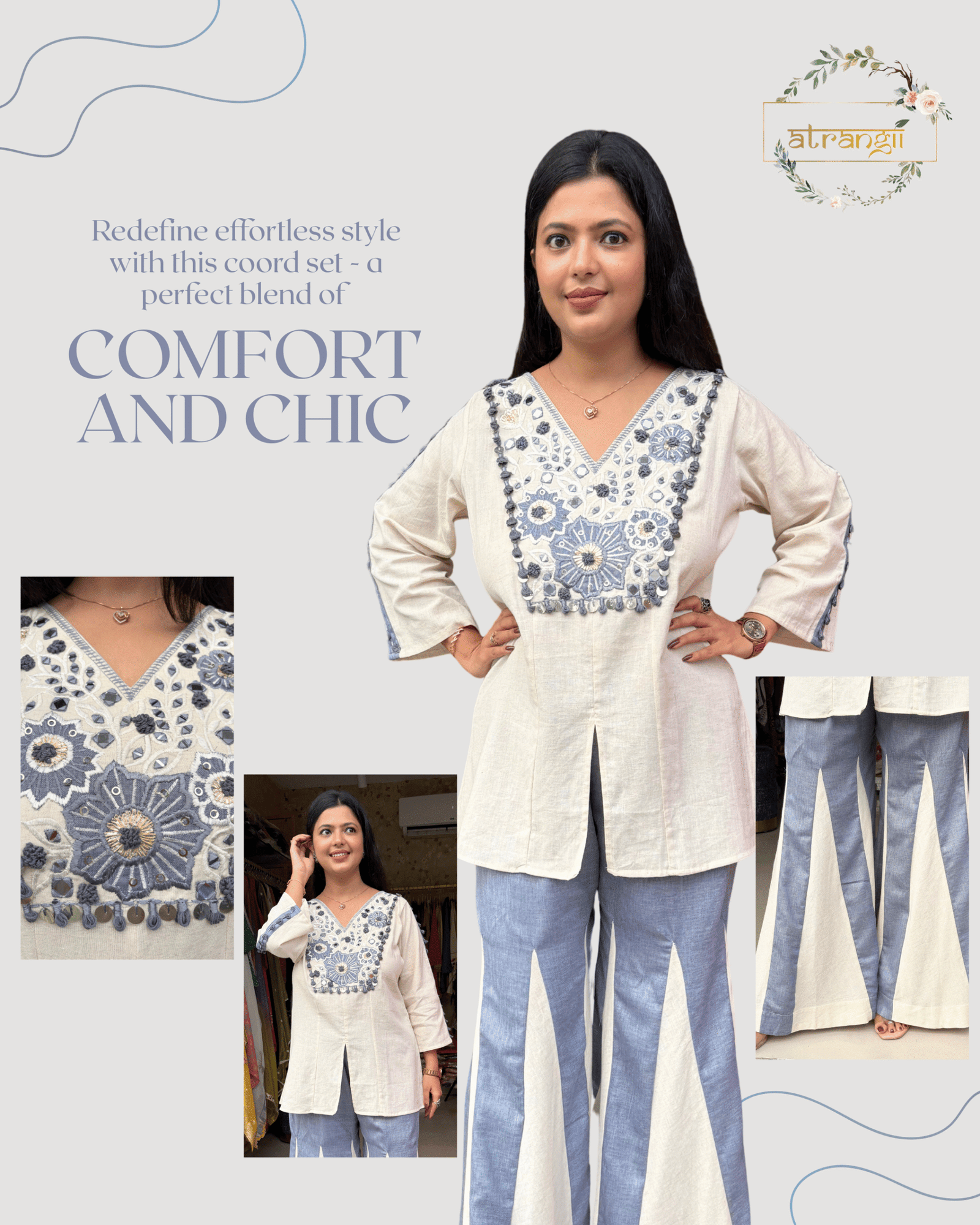 Elevate your everyday ethnic wardrobe with this stylish and breezy cotton-linen fusion co-ord set. The kurta features a flattering V-neckline adorned with intricate hand embroidery and mirror work in shades of grey and navy, lending it a handcrafted charm that stands out.