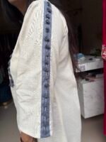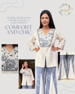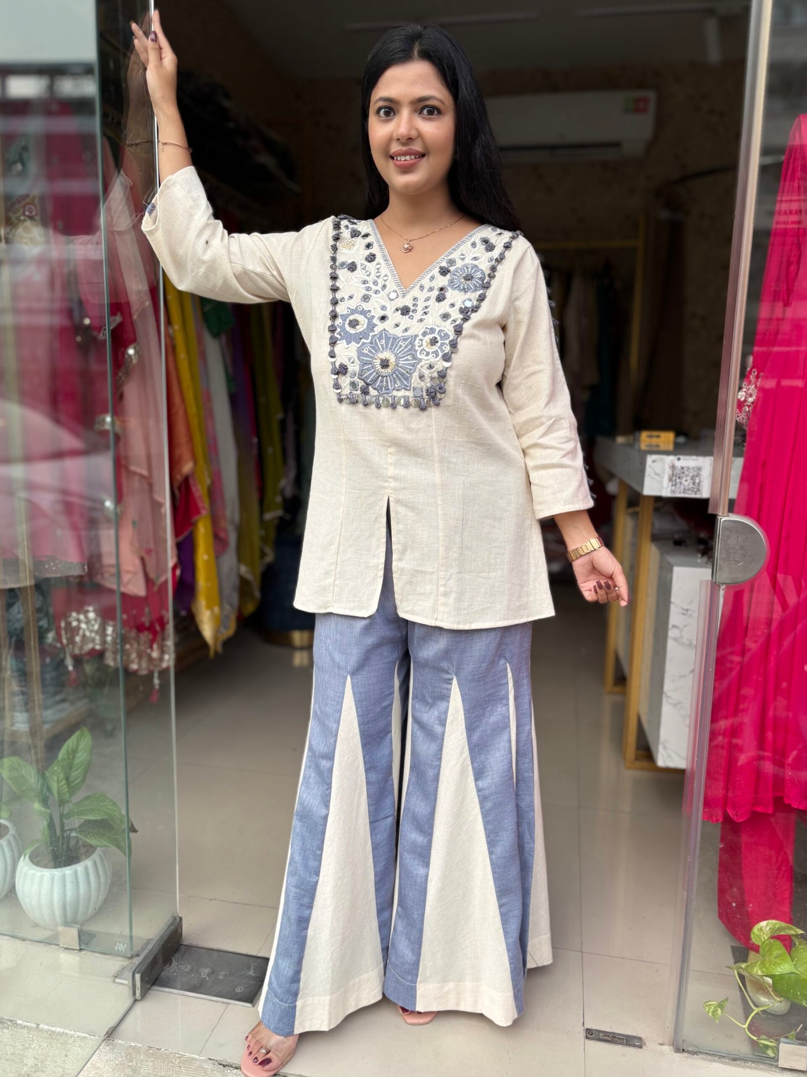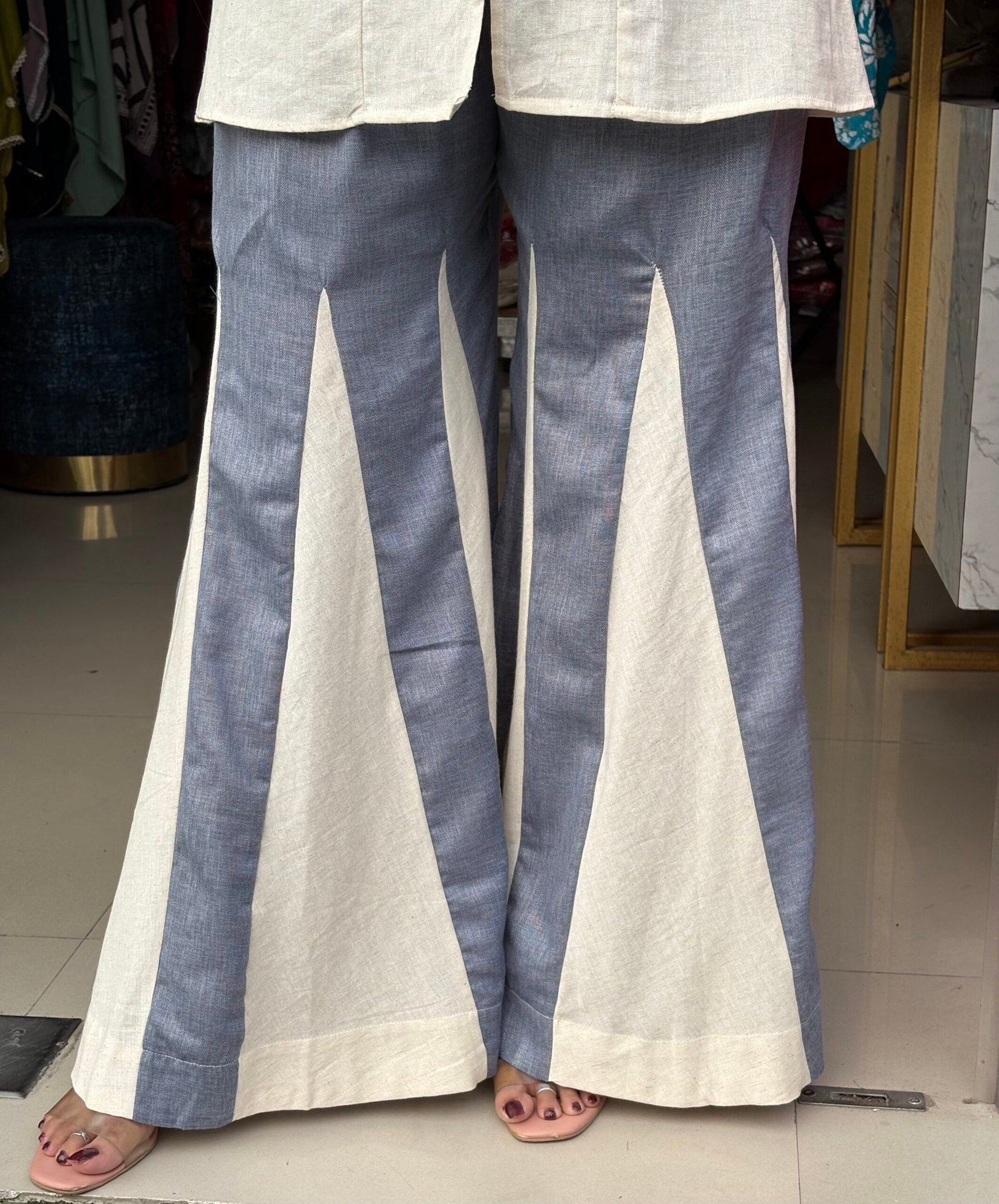 Paired with wide-legged flared palazzo pants that feature contrasting triangular inserts, this look strikes the perfect balance between tradition and contemporary fashion. The neutral tones of cream and soft blue make it versatile for casual outings, office wear, or festive brunches.
