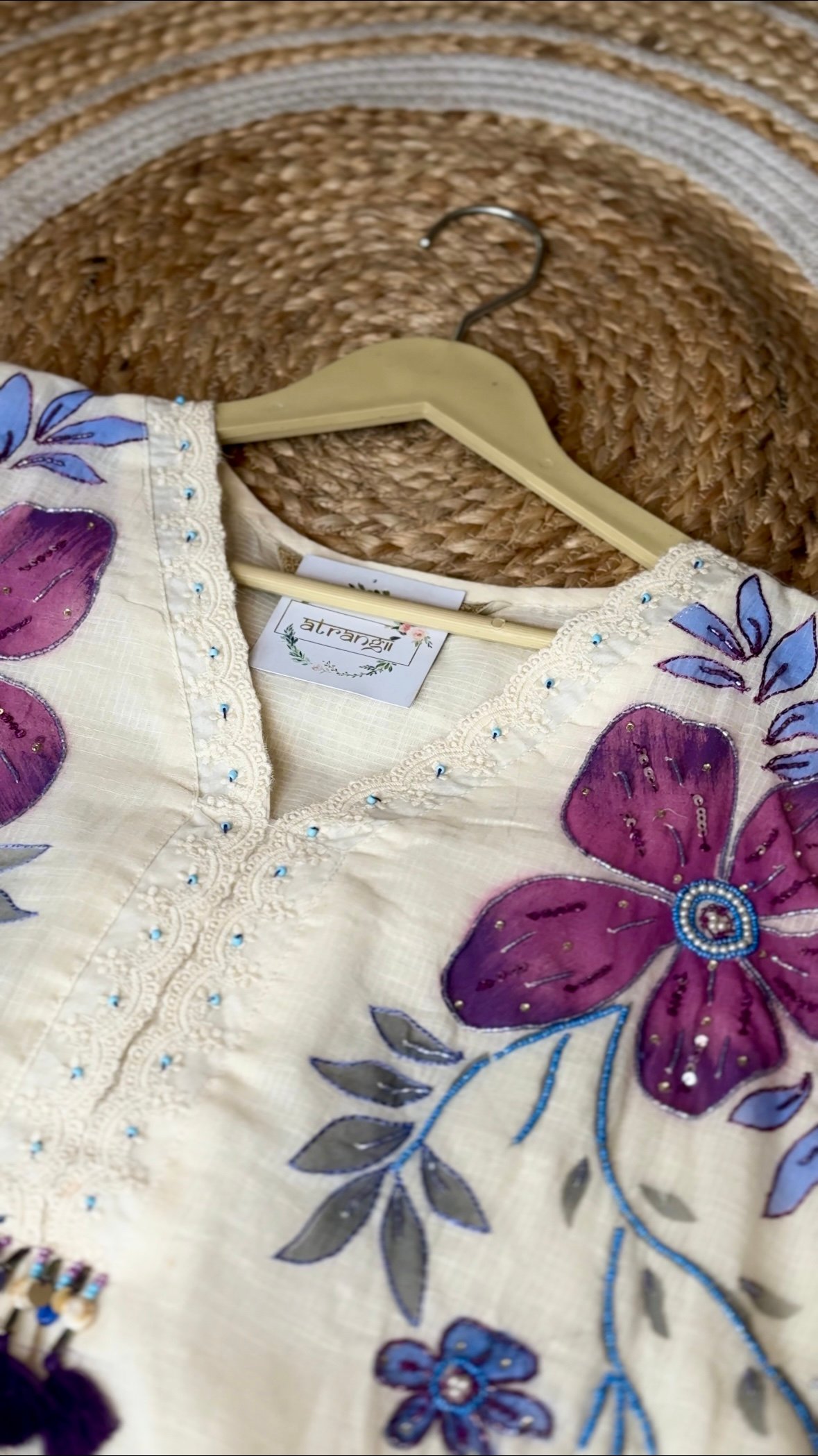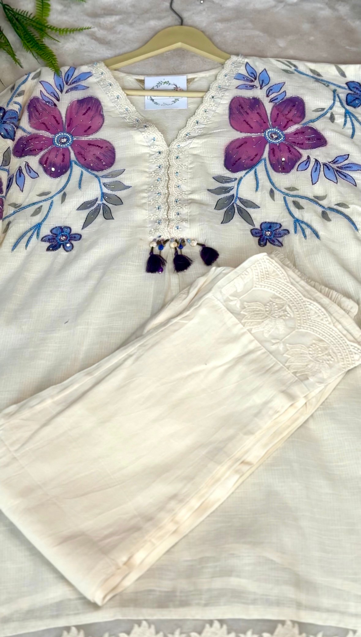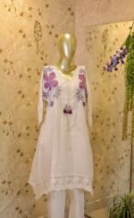 Elevate your ethnic wardrobe with this off-white cotton co-ord set. Crafted from breathable, high-quality cotton, the ensemble features delicate hand-painted floral motifs accentuated by intricate embroidery, offering a truly artisanal touch. Perfect for festive gatherings, casual celebrations, or getaways this co-ord set brings understated elegance with every wear. Key Features: Pure cotton fabric for all-day comfort , Hand-painted floral design with fine embroidery , Elegant lace detailing , Ideal for summer festivities and day events.