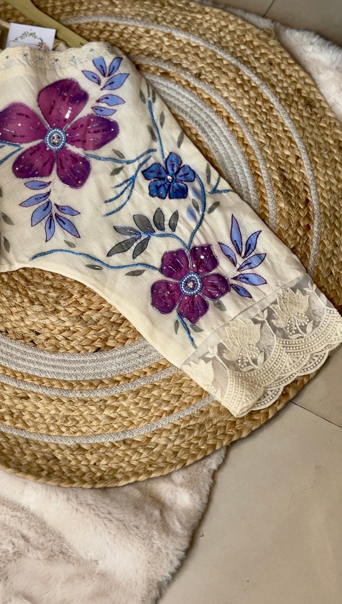 Hand-painted floral motifs , intricate embroidery , lace detailing