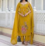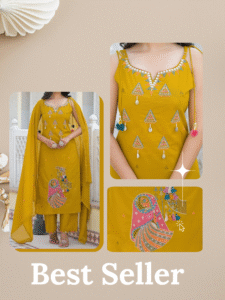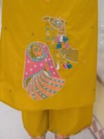 This mustard suit is sunshine stitched into style – light, lively and endlessly wearable. Crafted with breathable cotton this mustard sleeveless suit is a perfect blend of style, comfort and elegance. Subtle thread embroidery with shells and pom pom tassels adds a graceful touch without overwhelming the simplicity. It is paired with straight cotton pants and cotton dupatta which makes a clean silhouette and all day comfort. It is perfect for daytime pujas, small gatherings, workwear or summer getaways.