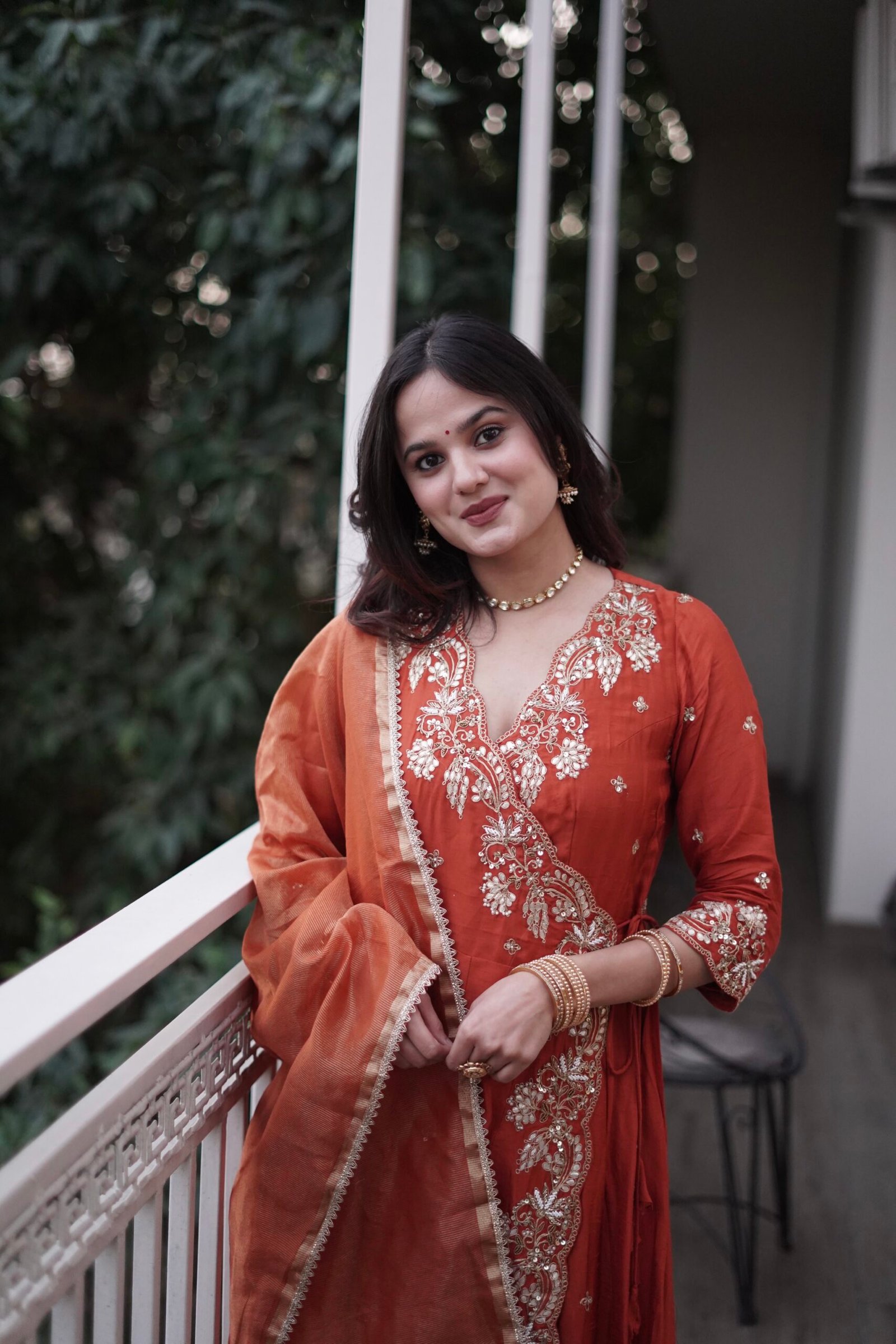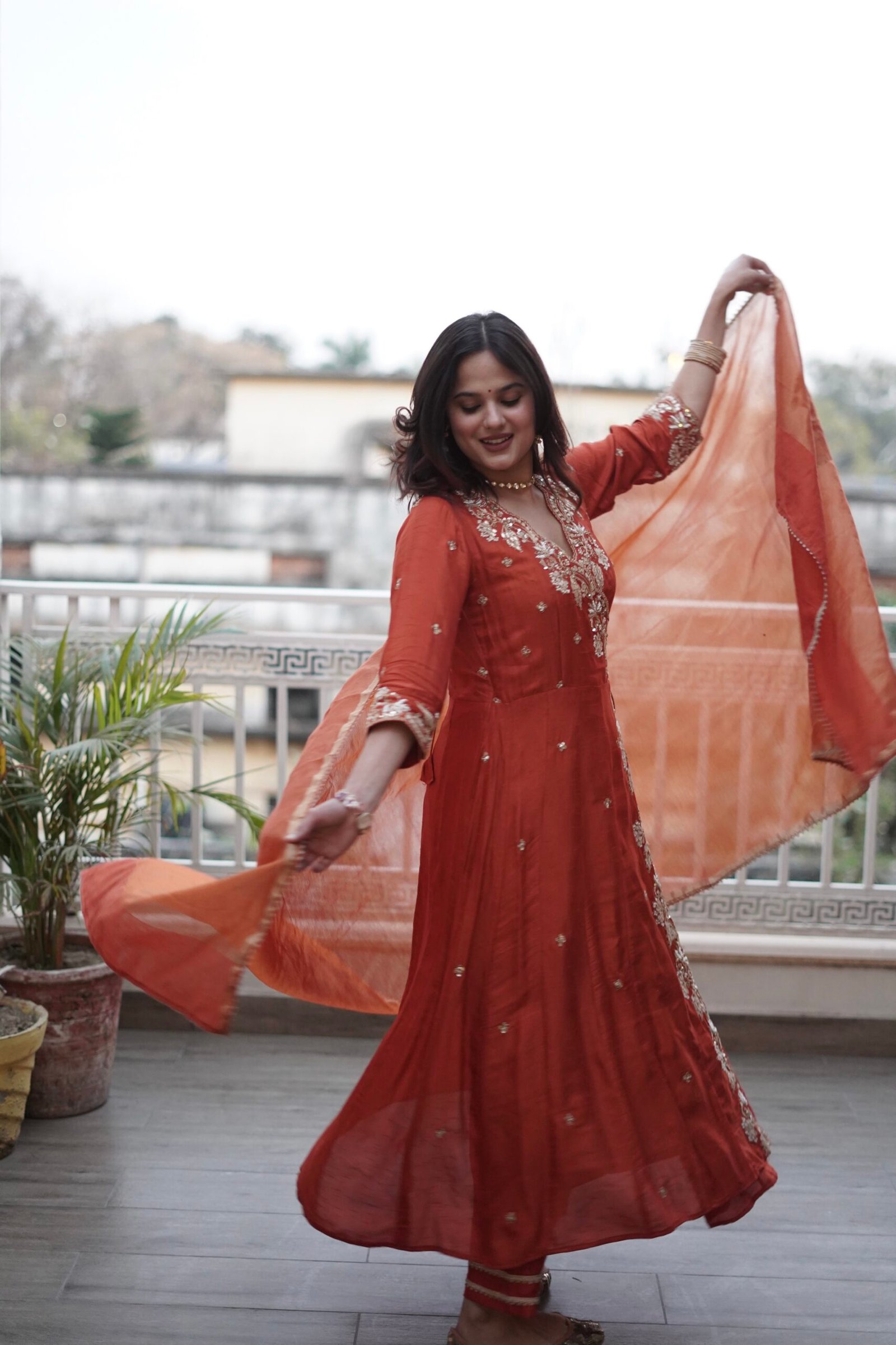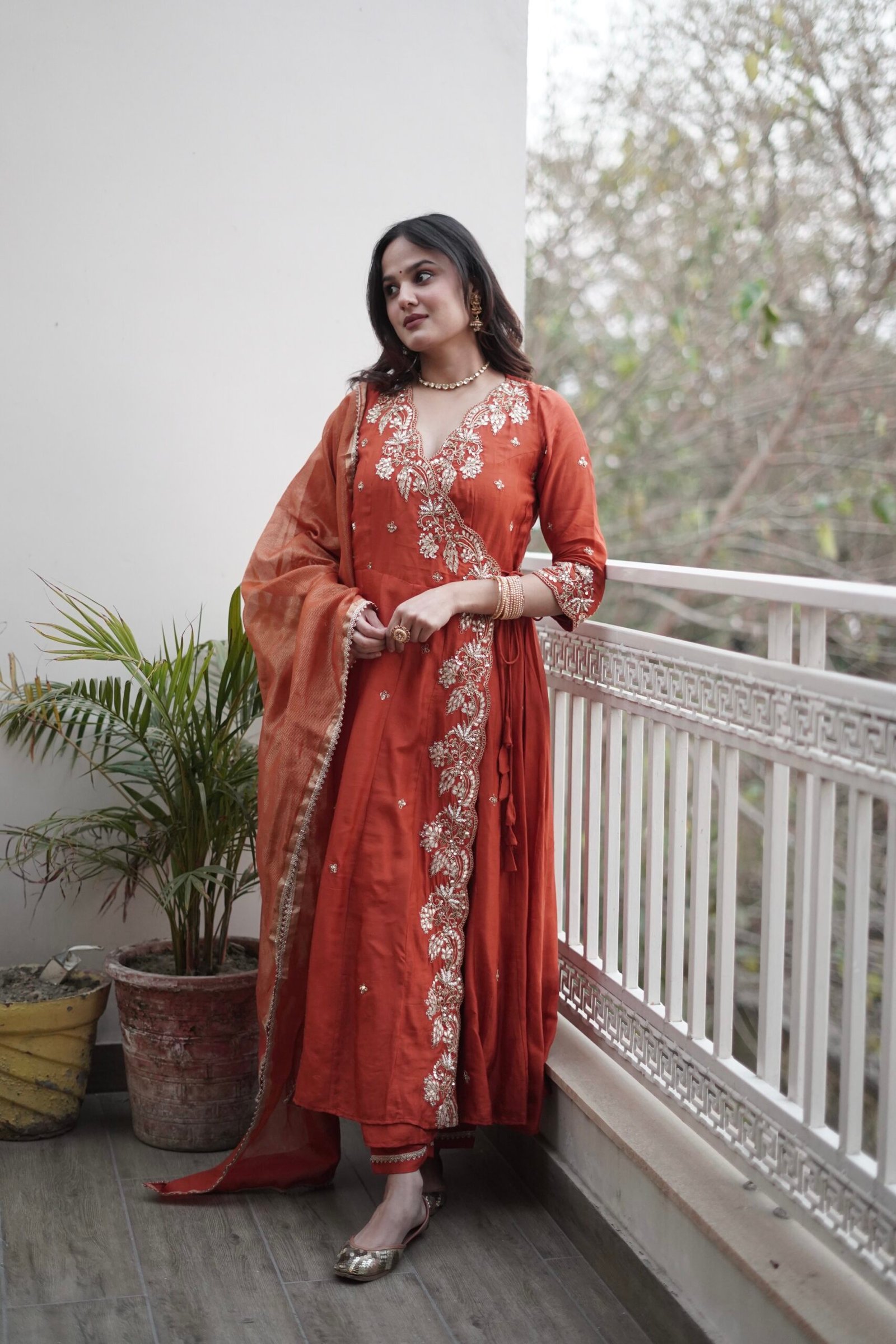 With a structured wrap-around style, the Angrakha pattern highlights the waist beautifully while offering an elegant, elongated look.This Dola silk angrakha suit captures the essence of festive joy.