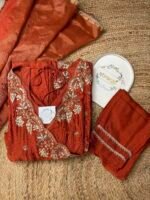 Step into the world of luxury and tradition with our exquisite Dola Silk Angrakha Pattern Hand Embroidery Suit. Crafted to perfection, this ensemble seamlessly blends the timeless elegance of Dola silk with intricate hand embroidery, creating a stunning masterpiece that will make you feel like royalty.