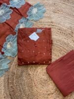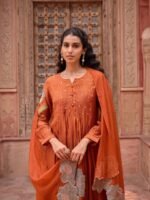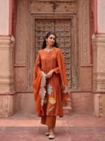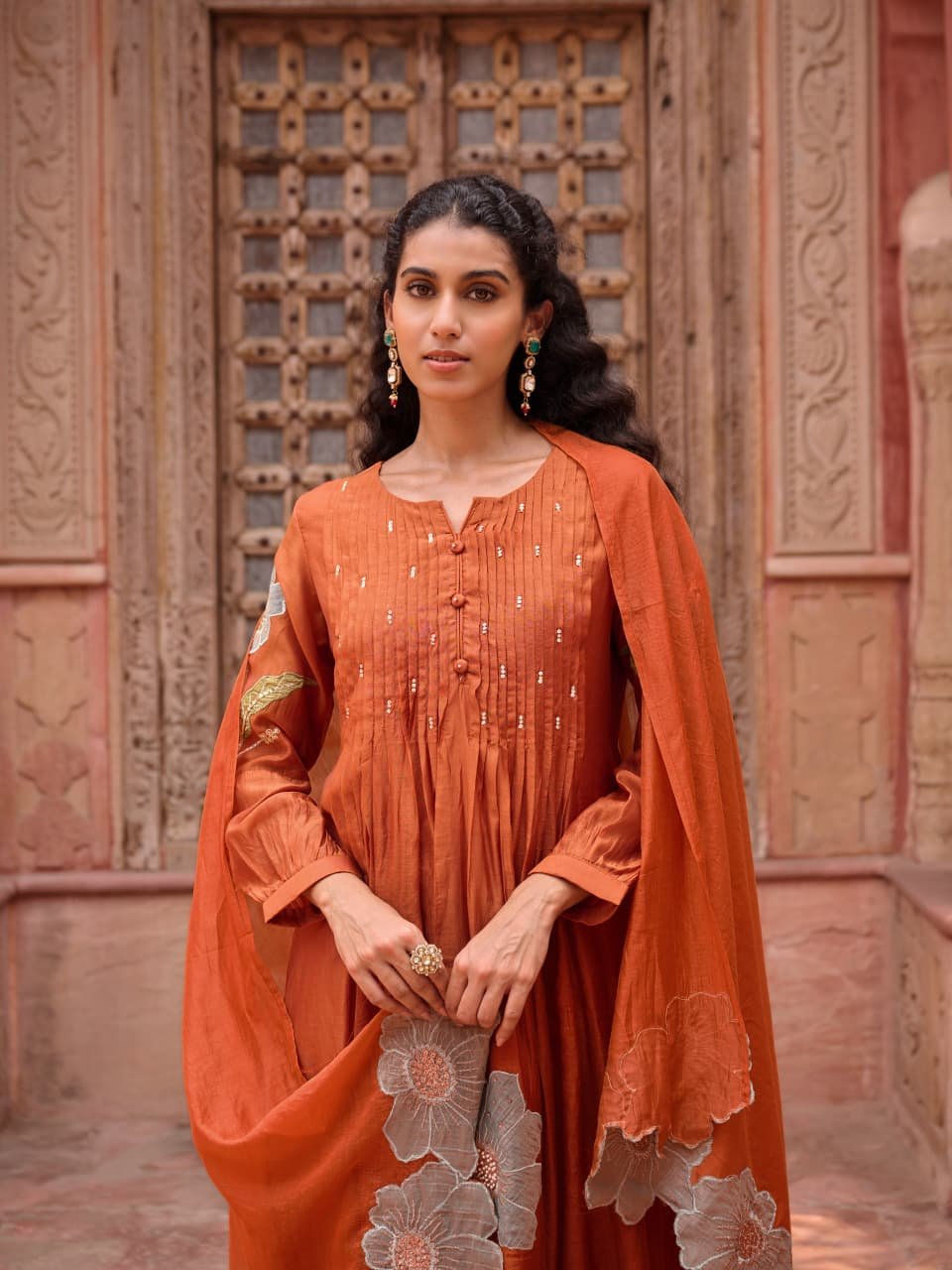 Step into sophistication with this beautifully crafted three-piece suit set in a warm rust tone, made from mul Chanderi fabric .The kurta features delicate pleating and intricate hand embellishments, adding depth and dimension to the silhouette. The highlight of the look is the flowing dupatta, adorned with oversized floral applique work in pastel hues, creating a striking contrast and an artistic flair.
