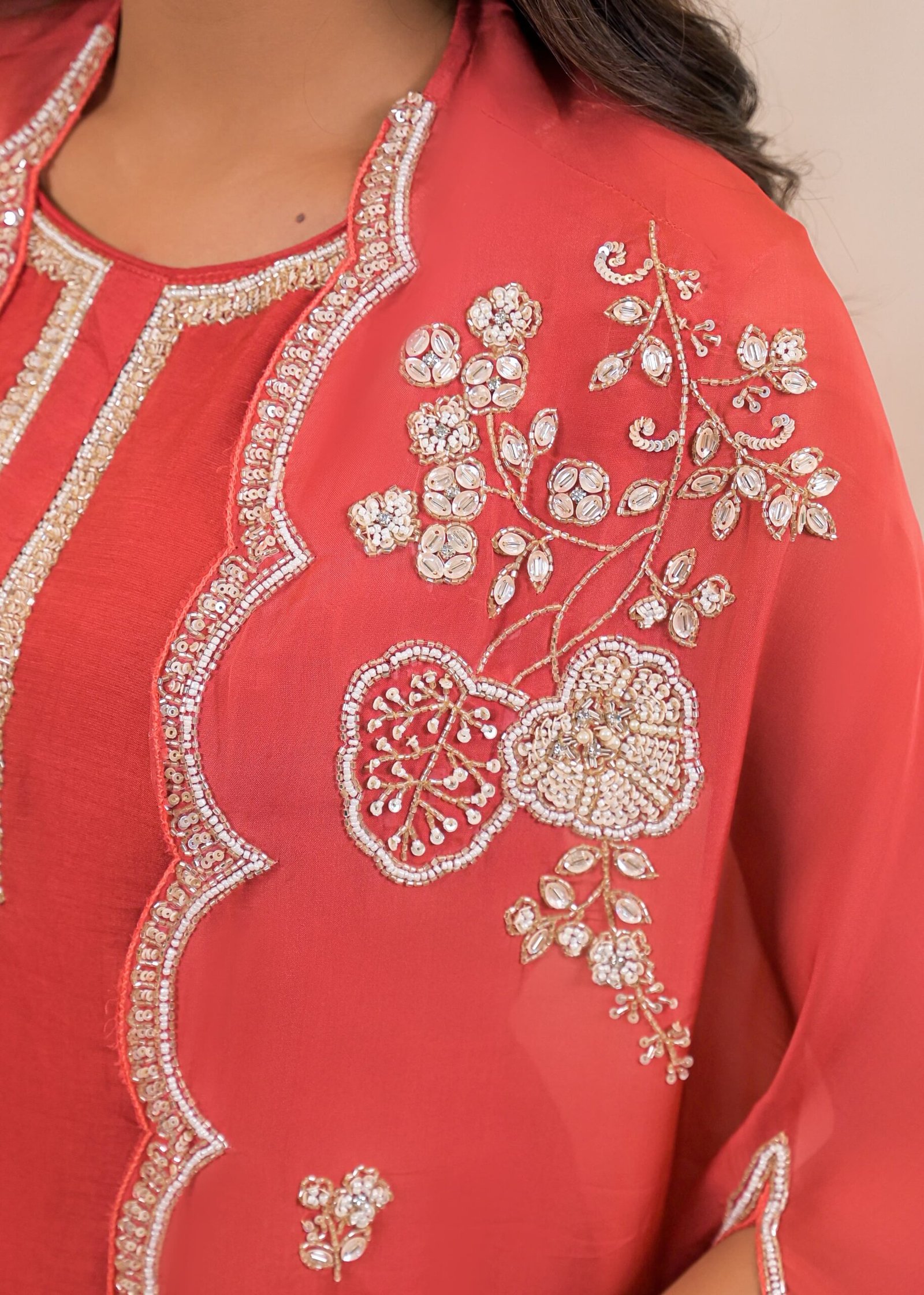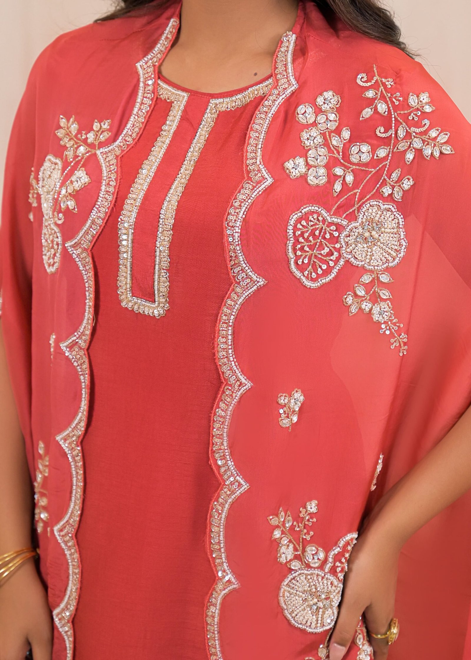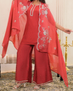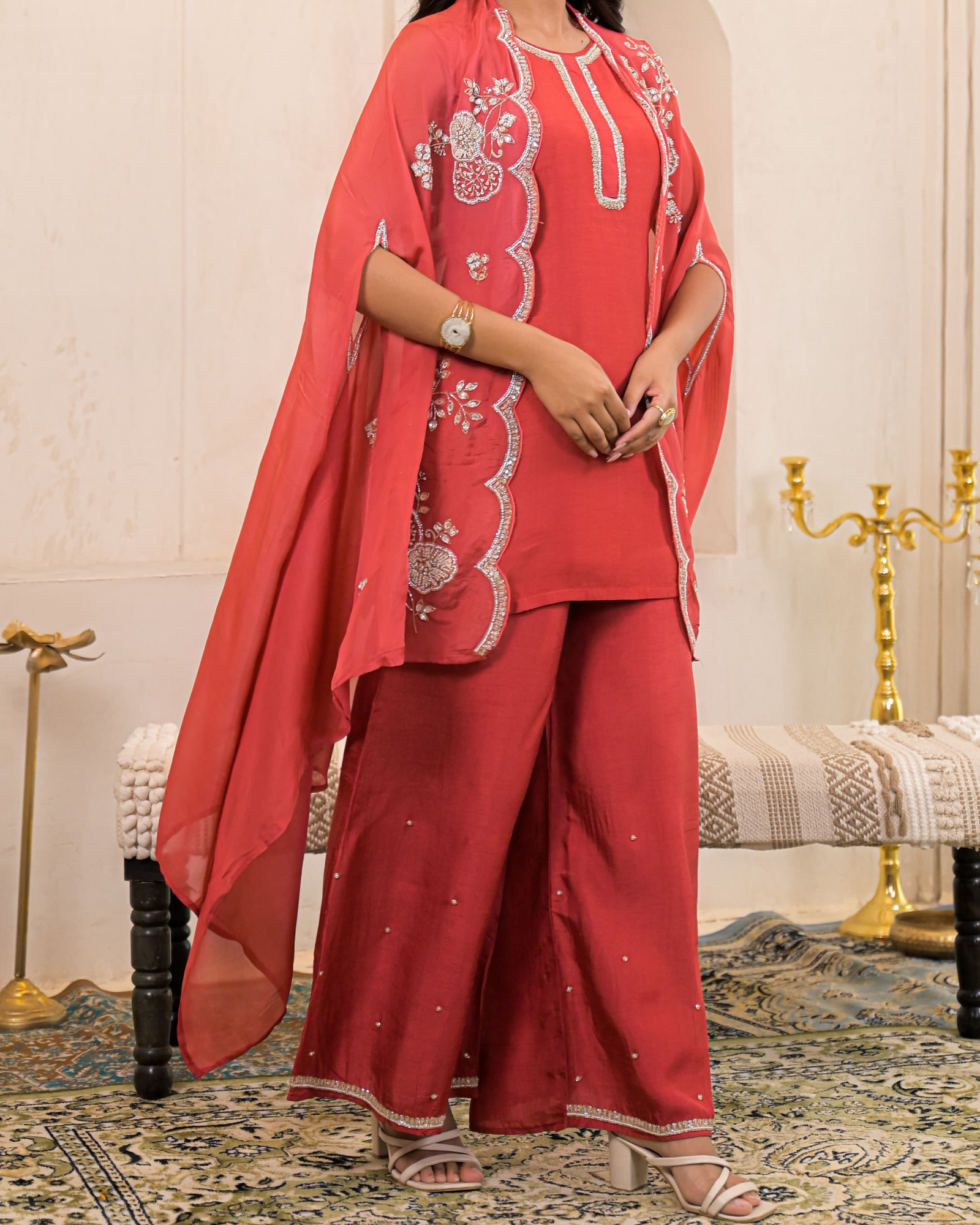This elegant three-piece ensemble is a perfect blend of traditional charm and contemporary grace. Featuring a rich rust hue, the outfit consists of a straight-cut kurta adorned with delicate  embellishments around the neckline and paired with wide-legged palazzo pants subtly dotted with sequins for a hint of sparkle. The highlight of the ensemble is the flowy organza cape with intricate embroidery and scalloped edges, adding a regal touch to the overall look. This outfit is ideal for festive occasions, weddings, or evening gatherings.