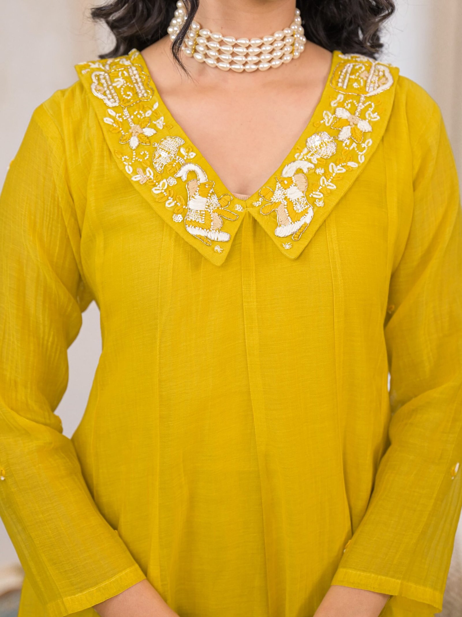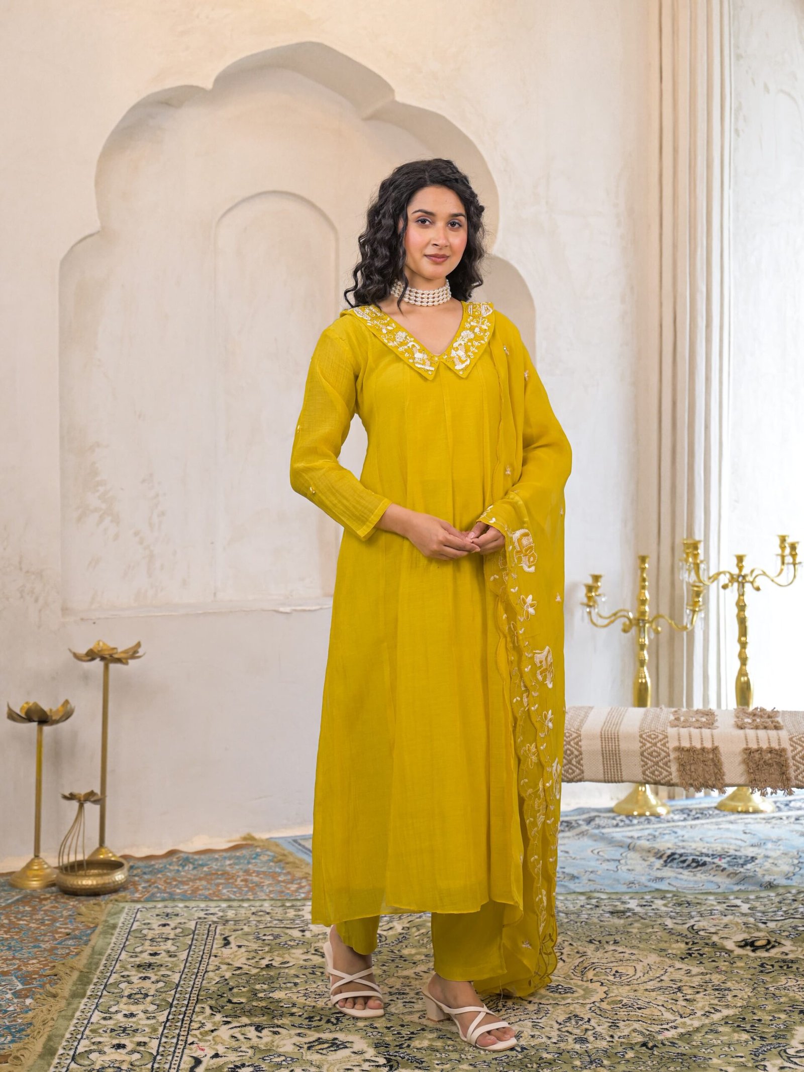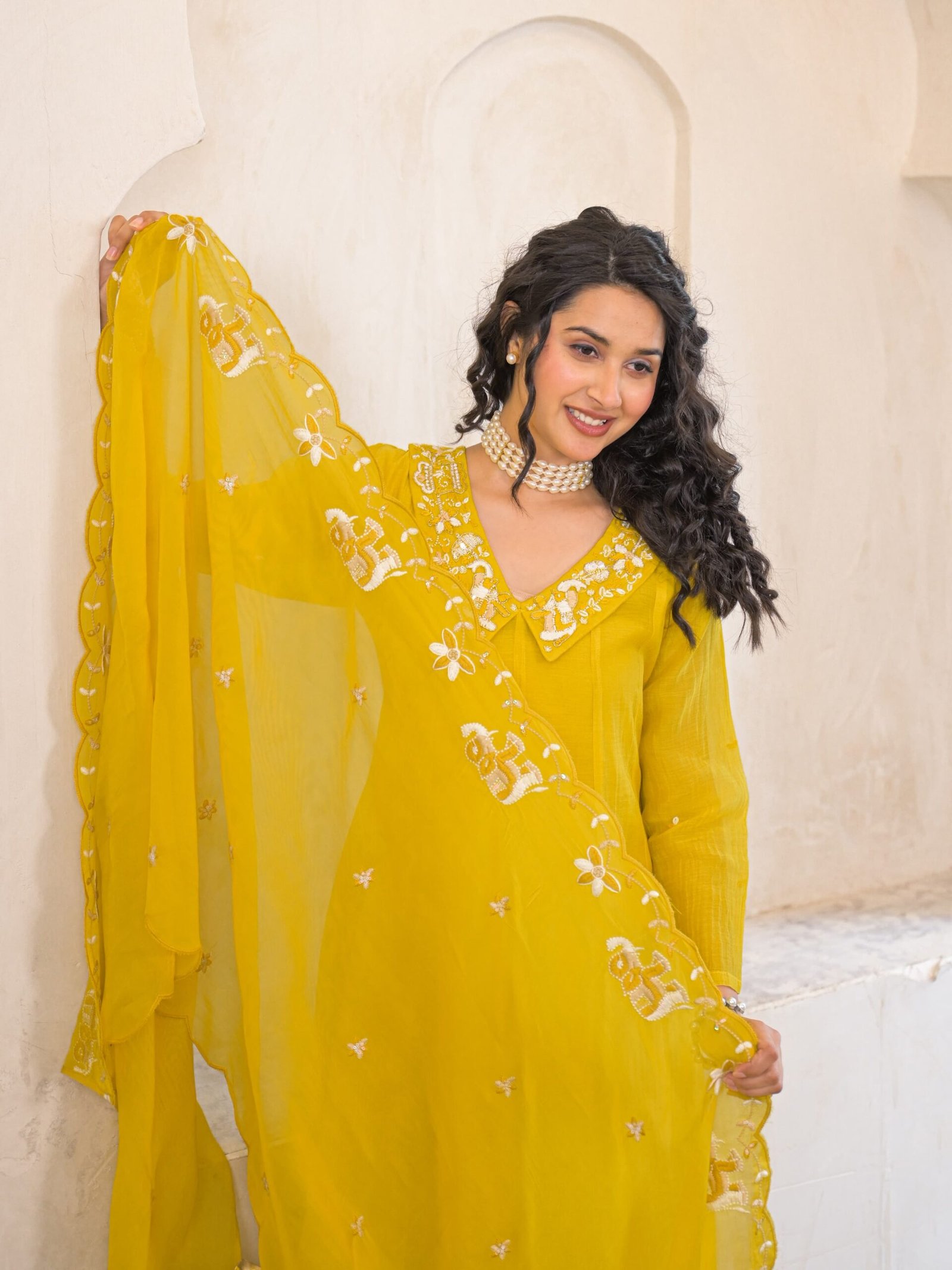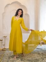 • Design: The suit features a mustard yellow hue with delicate embroidery around the neckline and on the dupatta.
