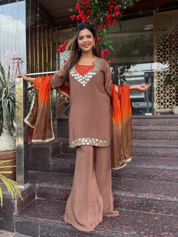 4 piece set includes a bustier , coordinated kurta , wide leg bottoms & a matching dupatta . sizes -38 to 44
